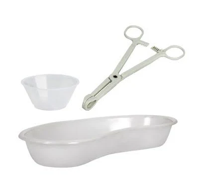 Kit Cateterismo Vesical 1, também conhecido como kit Antissepsia Estéril para realização de antissepsia da pele, composto por cuba redonda, cuba rim e pinça Pean (Coração) em resina de engenharia.